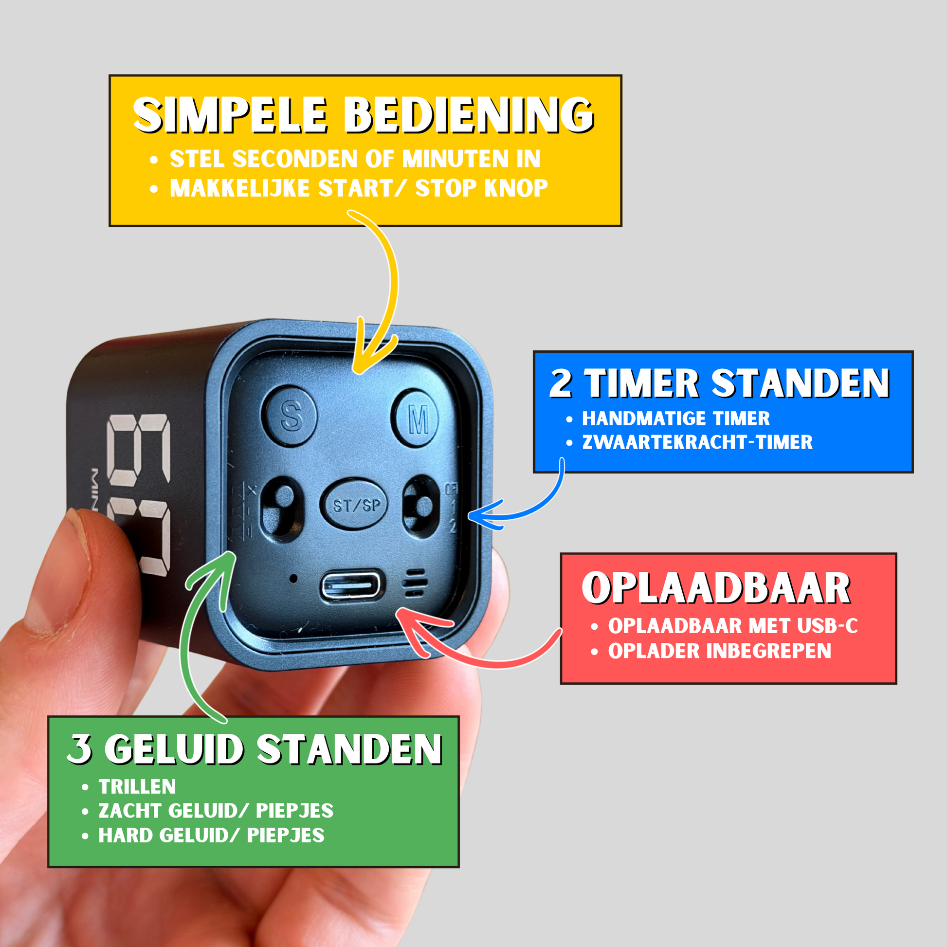 Deze timer is een hulpmiddel voor focus en timemanagement. Het is geen medisch hulpmiddel en vervangt geen professionele begeleiding bij concentratie- of aandachtsproblemen. Bevat een batterij, niet geschikt voor langdurige opslag in direct zonlicht of op warme oppervlakken. Niet gebruiken met beschadigde of oververhitte apparaten. Gebruik op eigen risico.